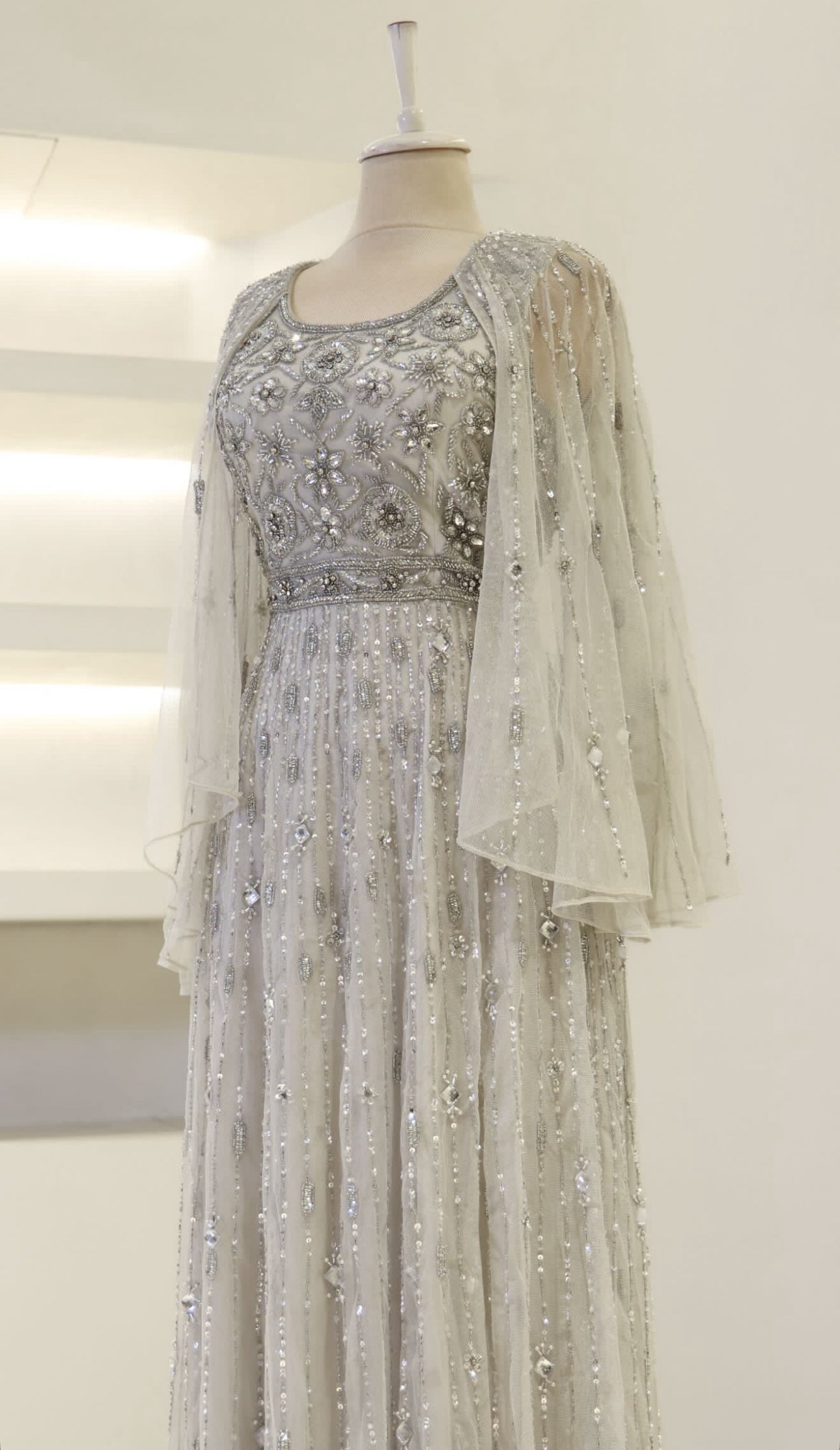 The intricate embroidery is crafted with high-quality threads that reflect light beautifully, giving the dress a luxurious and refined touch.