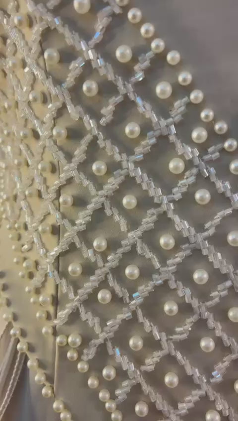 A layered gown featuring a hand-embroidered corset bodice. Designed with multiple soft layers that create movement and volume, paired with a delicately embellished upper corset for a refined, luxurious look.