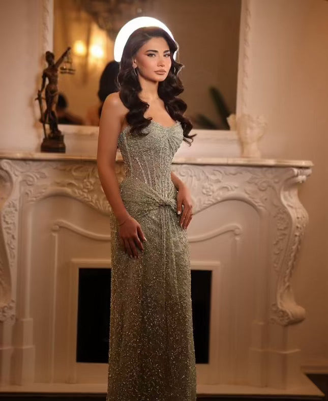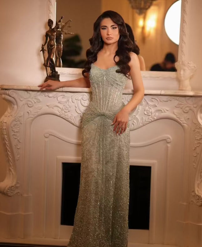 A luxurious light green gown designed to elegantly hug the body, featuring delicate ruching at the waist to enhance the silhouette and create a flattering hourglass shape.