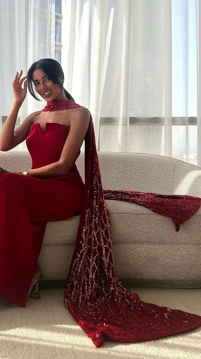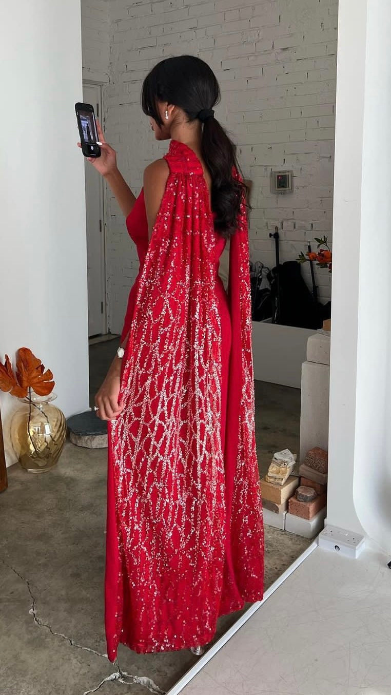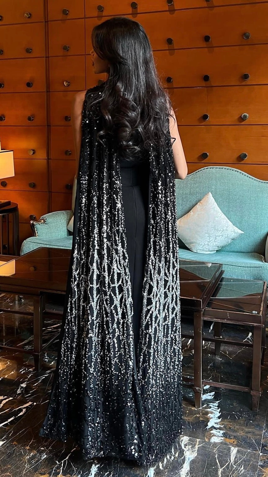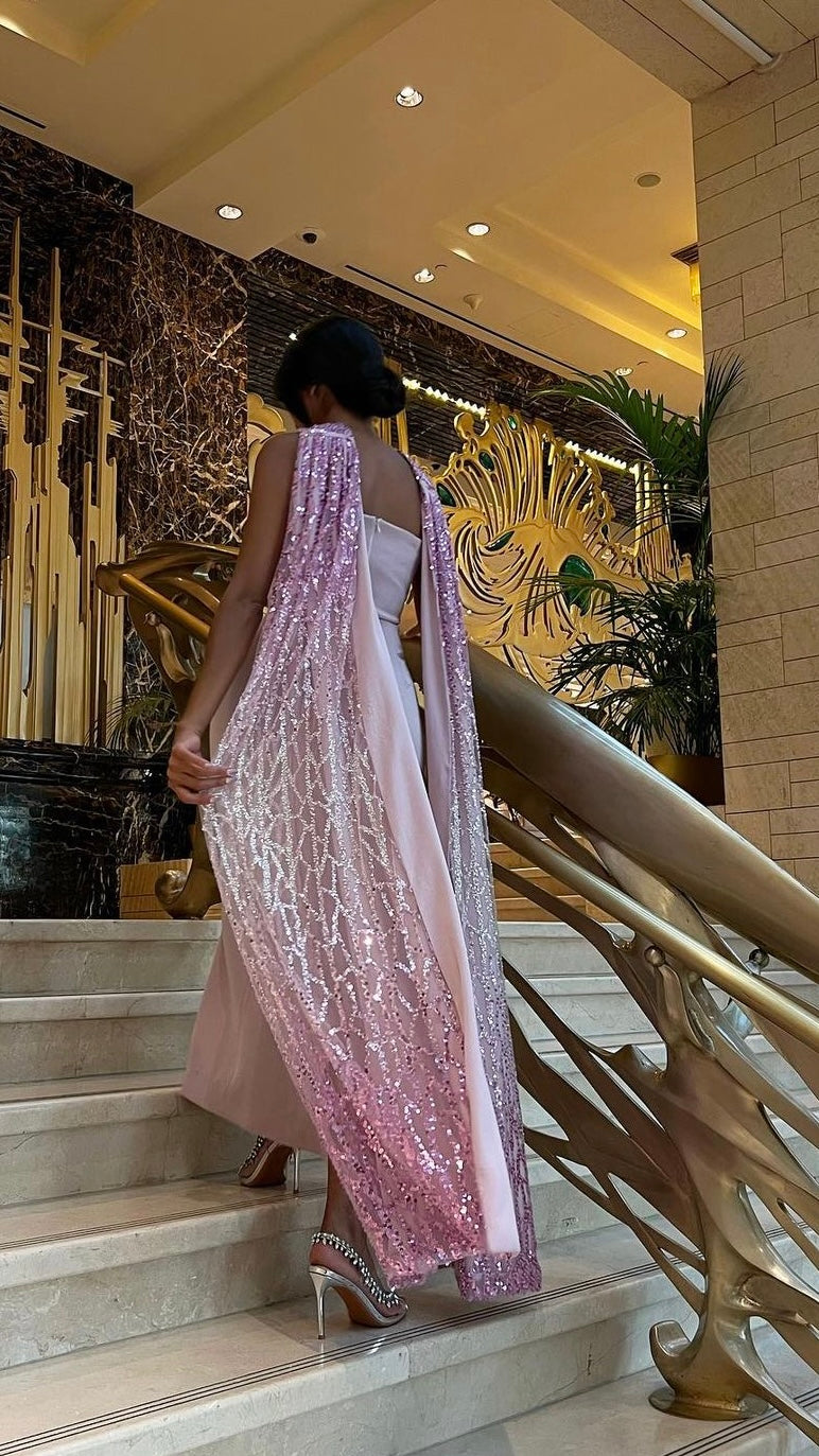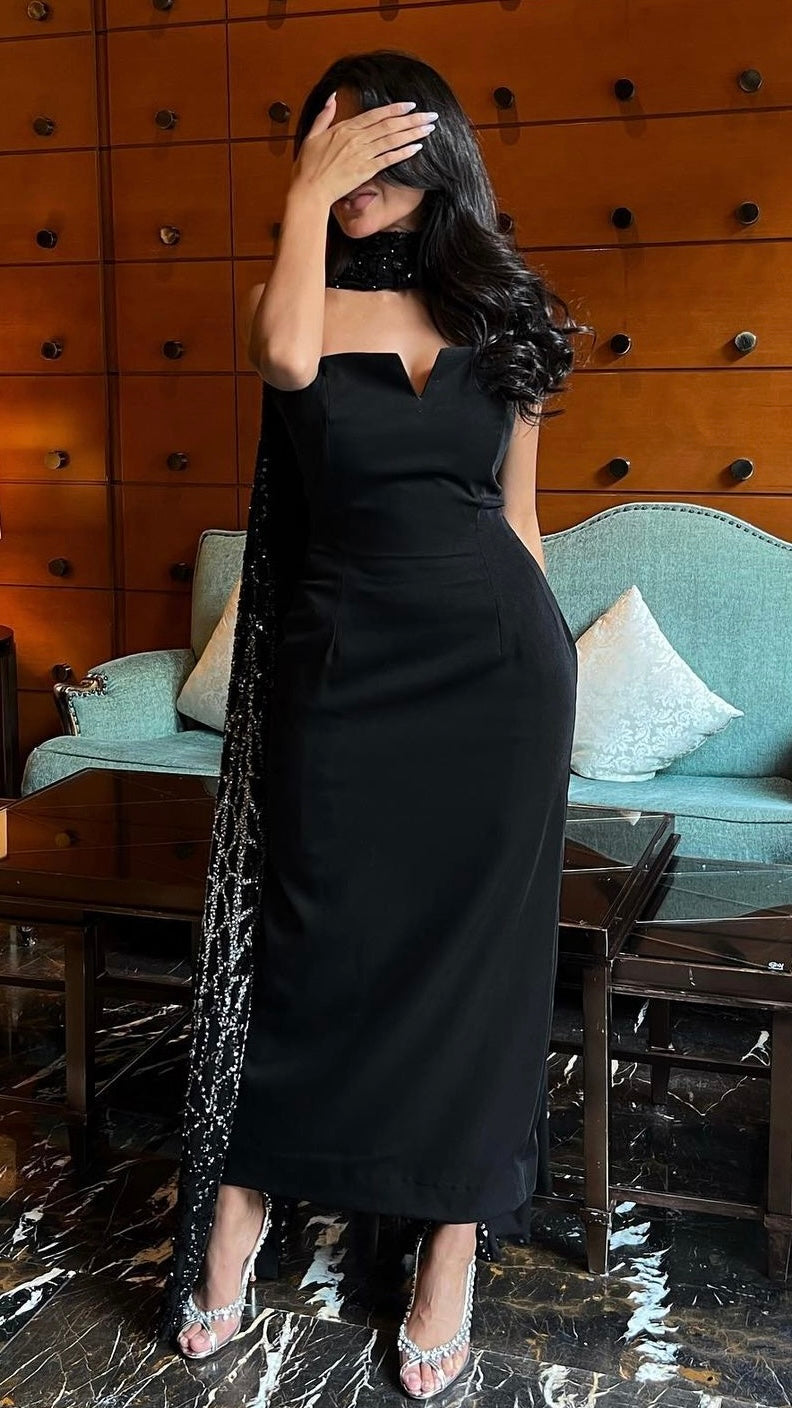 A ready-to-wear two-piece cut dress made of stretch crepe with an ombre embroidered shawl.