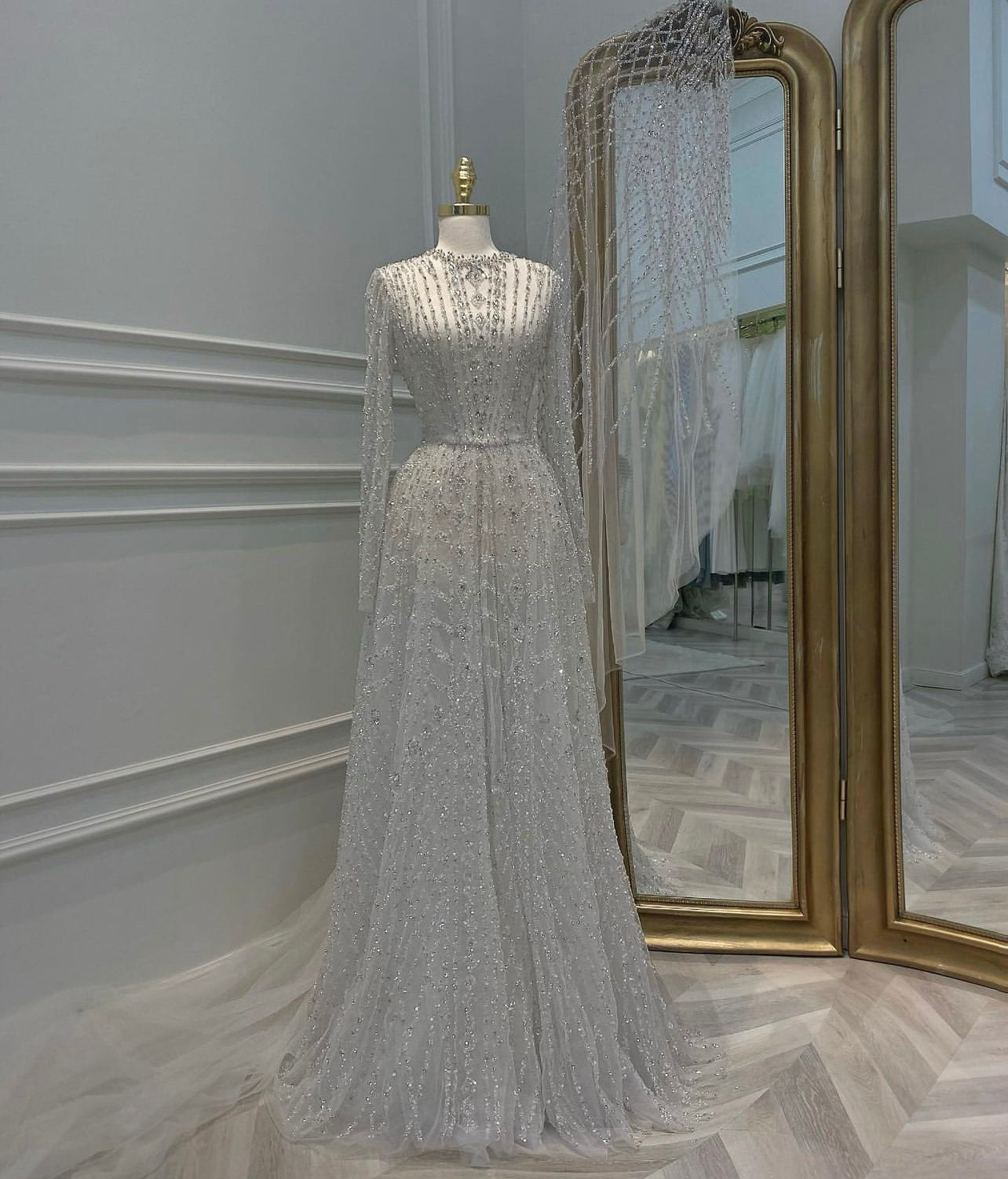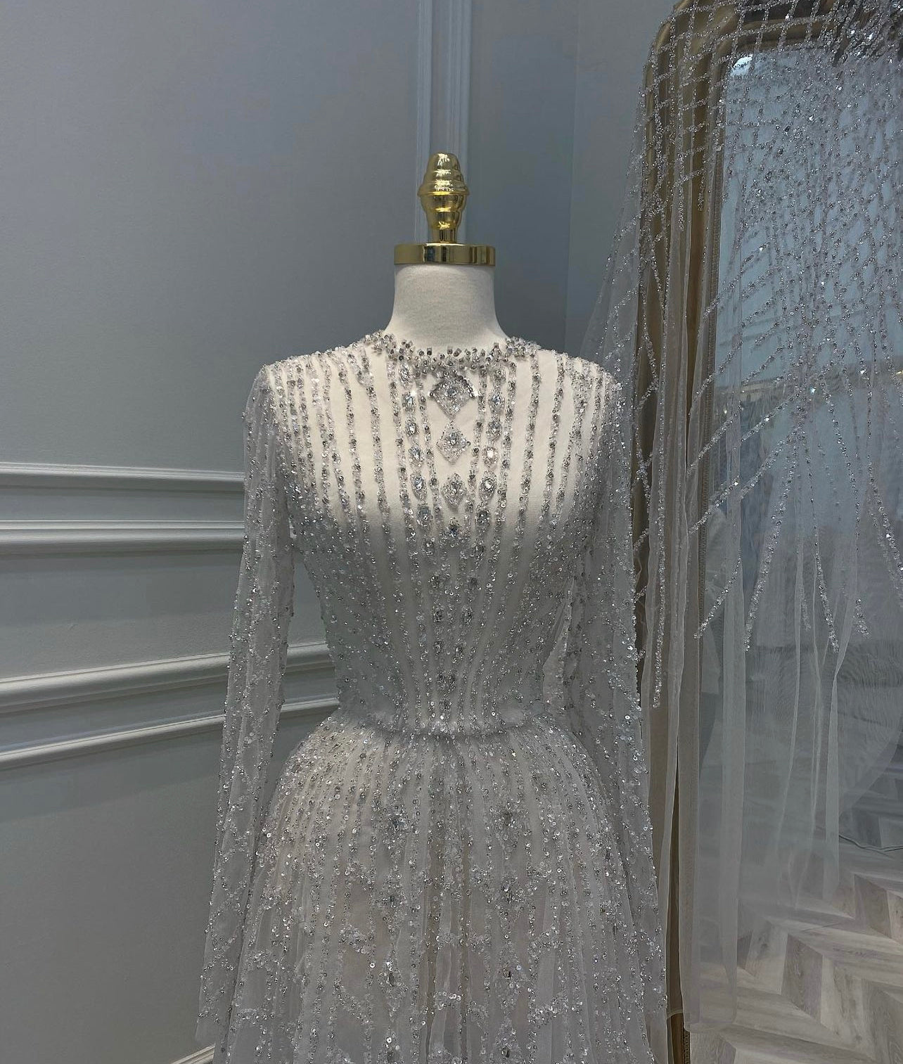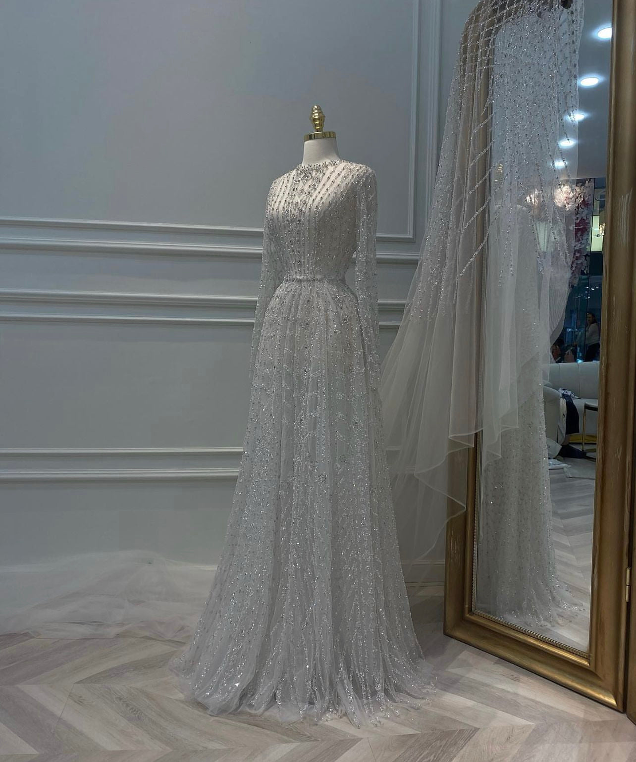 A custom-made evening dress made from embroidered tulle, hand-embroidered with the finest types of beads and crystals, featuring intensive embroidery